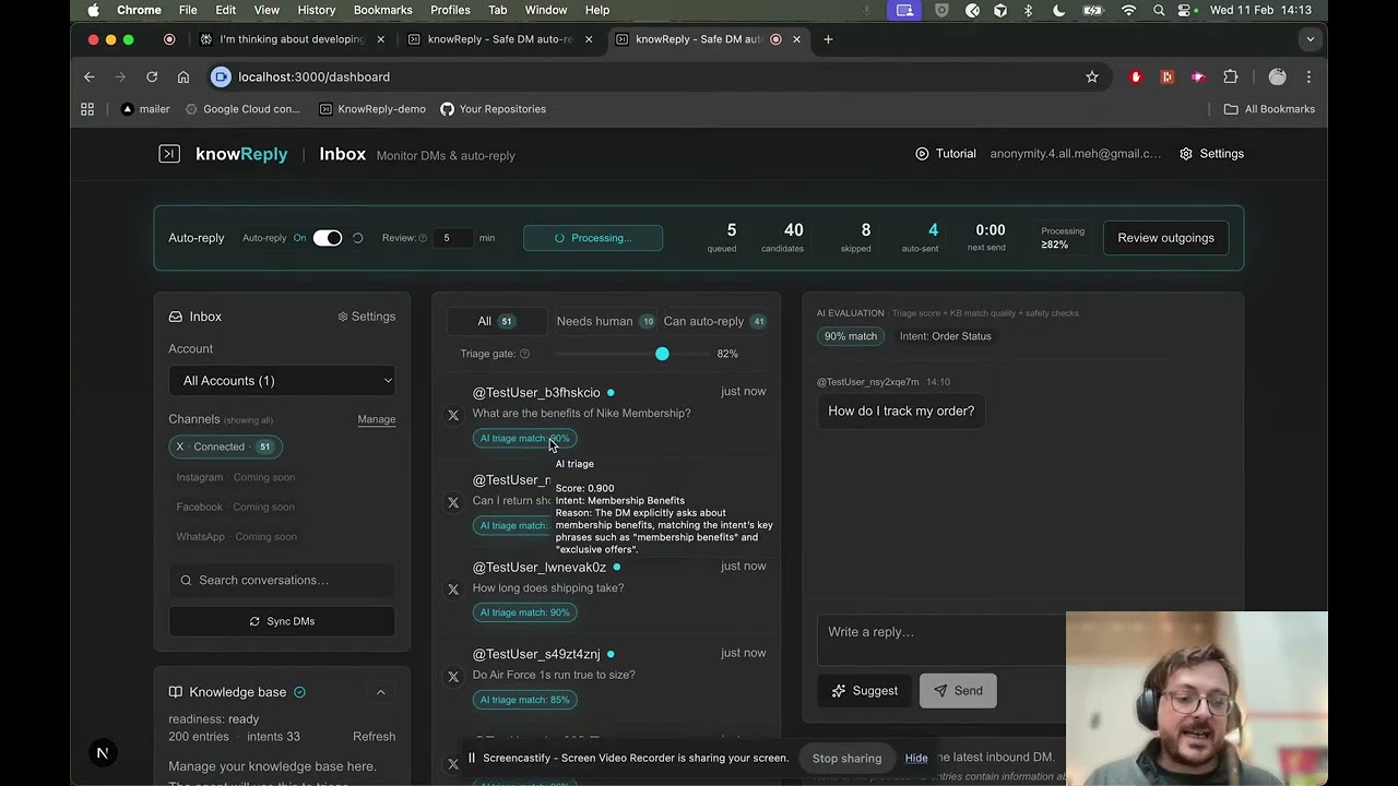 Every inbound DM is triaged against your knowledge base. This is a fast estimation of whether the topic is covered in the KB. High-confidence matches are marked “can auto-reply”, then an AI agent goes deeper to craft accurate, grounded responses.